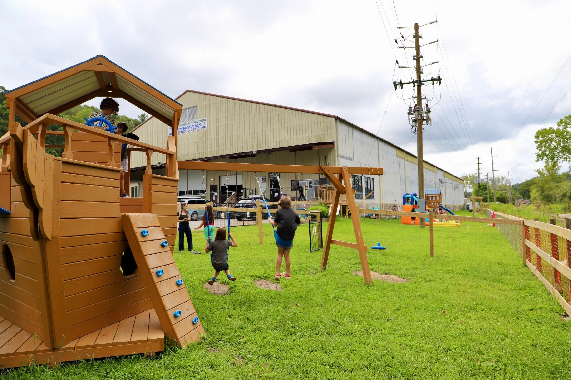 Our facility is also right along the French Broad River. Our outdoor space is fenced, and we do not spend time in the river due to how high the river tends to stay and concerns over cleanliness of the French Broad. However, it provides a beautiful back drop for their play and provides a nice breeze off the water.
